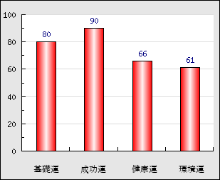 成功運 目的に対する成功運の強さをあらわします。この点数が高いほど自分の思い通りに成功し、逆に悪いと逆境・批判・障害などに苦心します。 90点