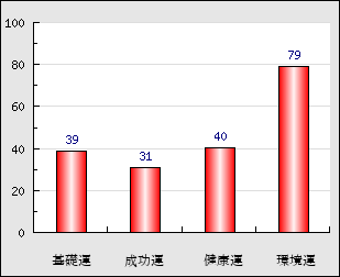 | 健康運 | 体力・健康に恵まれるか否かをあらわします。先天的に健康に恵まれても、これが悪いと次第に病弱となり、種々の病気に悩まされやすくなります。 | 40点 |