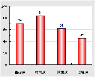 成功運 目的に対する成功運の強さをあらわします。この点数が高いほど自分の思い通りに成功し、逆に悪いと逆境・批判・障害などに苦心します。 84点
