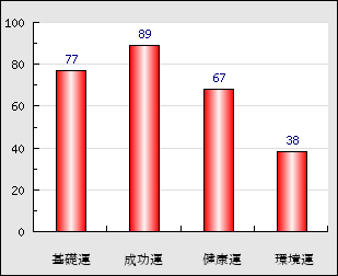 成功運 目的に対する成功運の強さをあらわします。この点数が高いほど自分の思い通りに成功し、逆に悪いと逆境・批判・障害などに苦心します。 89点