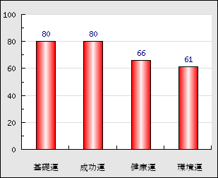 成功運 目的に対する成功運の強さをあらわします。この点数が高いほど自分の思い通りに成功し、逆に悪いと逆境・批判・障害などに苦心します。 80点