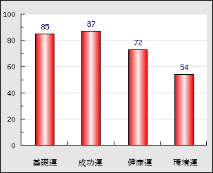 成功運 目的に対する成功運の強さをあらわします。この点数が高いほど自分の思い通りに成功し、逆に悪いと逆境・批判・障害などに苦心します。 87点