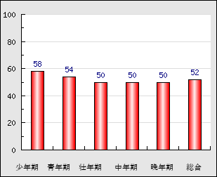 ※年代別運勢グラフは、あくまでも時期別の運勢を概算したものですので参考程度にご覧ください。少年期や青年期の運勢が平均と比べて高い場合は比較的若い頃に成功や幸福があり、反対に中年期や晩年期の運勢が平均と比べて高い場合は後年に華開く大器晩成型と言えるでしょう。ただし、少年期の運勢が低いからと言って、若い頃は成功しないといったことではありません。