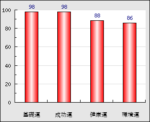 成功運 目的に対する成功運の強さをあらわします。この点数が高いほど自分の思い通りに成功し、逆に悪いと逆境・批判・障害などに苦心します。 98点