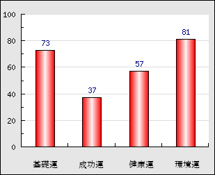 成功運 目的に対する成功運の強さをあらわします。この点数が高いほど自分の思い通りに成功し、逆に悪いと逆境・批判・障害などに苦心します。 37点