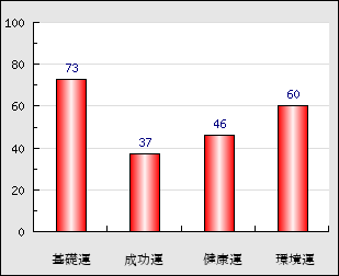 成功運 目的に対する成功運の強さをあらわします。この点数が高いほど自分の思い通りに成功し、逆に悪いと逆境・批判・障害などに苦心します。 37点
