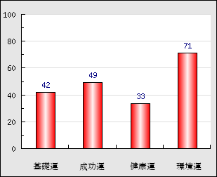 成功運 目的に対する成功運の強さをあらわします。この点数が高いほど自分の思い通りに成功し、逆に悪いと逆境・批判・障害などに苦心します。 49点