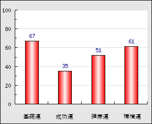 成功運 目的に対する成功運の強さをあらわします。この点数が高いほど自分の思い通りに成功し、逆に悪いと逆境・批判・障害などに苦心します。 35点