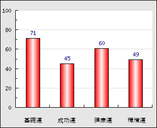 環境運 家庭や職場等での援助運・環境運を司ります。これが良いと配偶者や子供・職場の同僚などから助力が得られやすく、悪いと波乱・不和・孤独などがあります。 49点