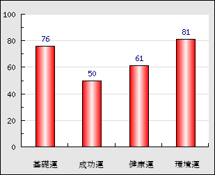 環境運 家庭や職場等での援助運・環境運を司ります。これが良いと配偶者や子供・職場の同僚などから助力が得られやすく、悪いと波乱・不和・孤独などがあります。 81点