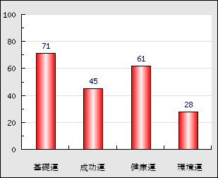 成功運 目的に対する成功運の強さをあらわします。この点数が高いほど自分の思い通りに成功し、逆に悪いと逆境・批判・障害などに苦心します。 45点