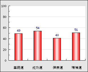 環境運 家庭や職場等での援助運・環境運を司ります。これが良いと配偶者や子供・職場の同僚などから助力が得られやすく、悪いと波乱・不和・孤独などがあります。 51点