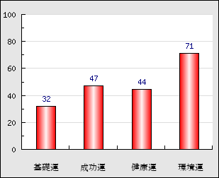 環境運 家庭や職場等での援助運・環境運を司ります。これが良いと配偶者や子供・職場の同僚などから助力が得られやすく、悪いと波乱・不和・孤独などがあります。 71点