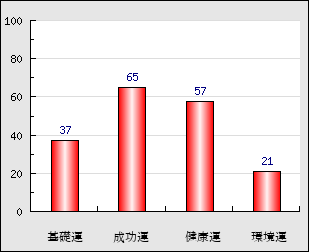 成功運 目的に対する成功運の強さをあらわします。この点数が高いほど自分の思い通りに成功し、逆に悪いと逆境・批判・障害などに苦心します。 65点
