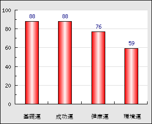 成功運 目的に対する成功運の強さをあらわします。この点数が高いほど自分の思い通りに成功し、逆に悪いと逆境・批判・障害などに苦心します。 88点