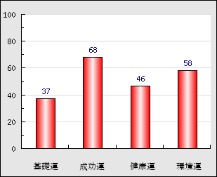 成功運 目的に対する成功運の強さをあらわします。この点数が高いほど自分の思い通りに成功し、逆に悪いと逆境・批判・障害などに苦心します。 68点