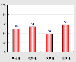 環境運 家庭や職場等での援助運・環境運を司ります。これが良いと配偶者や子供・職場の同僚などから助力が得られやすく、悪いと波乱・不和・孤独などがあります。 58点