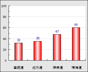 成功運 目的に対する成功運の強さをあらわします。この点数が高いほど自分の思い通りに成功し、逆に悪いと逆境・批判・障害などに苦心します。 35点