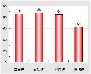 環境運 家庭や職場等での援助運・環境運を司ります。これが良いと配偶者や子供・職場の同僚などから助力が得られやすく、悪いと波乱・不和・孤独などがあります。 63点