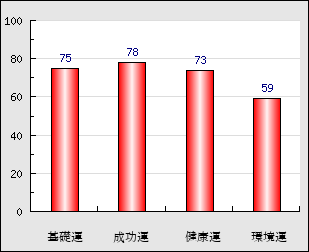 環境運 家庭や職場等での援助運・環境運を司ります。これが良いと配偶者や子供・職場の同僚などから助力が得られやすく、悪いと波乱・不和・孤独などがあります。 59点