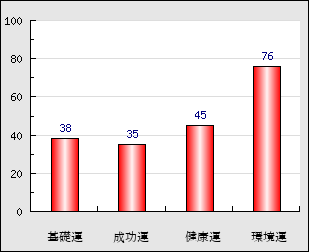 成功運 目的に対する成功運の強さをあらわします。この点数が高いほど自分の思い通りに成功し、逆に悪いと逆境・批判・障害などに苦心します。 35点