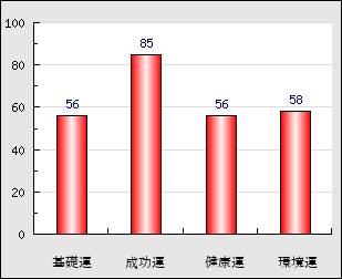 成功運 目的に対する成功運の強さをあらわします。この点数が高いほど自分の思い通りに成功し、逆に悪いと逆境・批判・障害などに苦心します。 85点