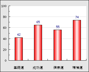 成功運 目的に対する成功運の強さをあらわします。この点数が高いほど自分の思い通りに成功し、逆に悪いと逆境・批判・障害などに苦心します。 65点