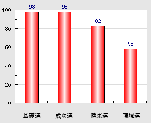 成功運 目的に対する成功運の強さをあらわします。この点数が高いほど自分の思い通りに成功し、逆に悪いと逆境・批判・障害などに苦心します。 98点