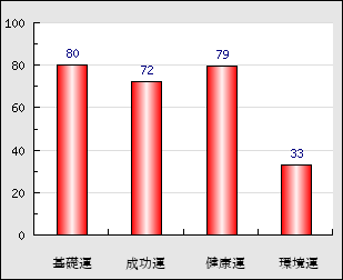 環境運 家庭や職場等での援助運・環境運を司ります。これが良いと配偶者や子供・職場の同僚などから助力が得られやすく、悪いと波乱・不和・孤独などがあります。 33点