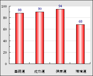 成功運 目的に対する成功運の強さをあらわします。この点数が高いほど自分の思い通りに成功し、逆に悪いと逆境・批判・障害などに苦心します。 90点