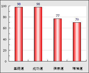 成功運 目的に対する成功運の強さをあらわします。この点数が高いほど自分の思い通りに成功し、逆に悪いと逆境・批判・障害などに苦心します。 98点