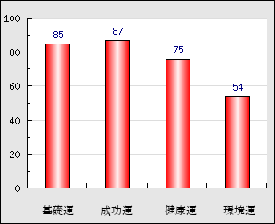 環境運 家庭や職場等での援助運・環境運を司ります。これが良いと配偶者や子供・職場の同僚などから助力が得られやすく、悪いと波乱・不和・孤独などがあります。 54点