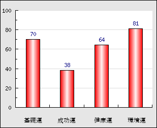 健康運 体力・健康に恵まれるか否かをあらわします。先天的に健康に恵まれても、これが悪いと次第に病弱となり、種々の病気に悩まされやすくなります。 64点