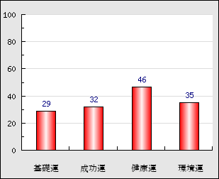 環境運 家庭や職場等での援助運・環境運を司ります。これが良いと配偶者や子供・職場の同僚などから助力が得られやすく、悪いと波乱・不和・孤独などがあります。 35点