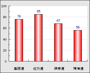 成功運 目的に対する成功運の強さをあらわします。この点数が高いほど自分の思い通りに成功し、逆に悪いと逆境・批判・障害などに苦心します。 85点