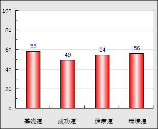 環境運 家庭や職場等での援助運・環境運を司ります。これが良いと配偶者や子供・職場の同僚などから助力が得られやすく、悪いと波乱・不和・孤独などがあります。 56点
