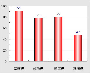 環境運 家庭や職場等での援助運・環境運を司ります。これが良いと配偶者や子供・職場の同僚などから助力が得られやすく、悪いと波乱・不和・孤独などがあります。 47点