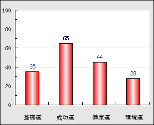 成功運 目的に対する成功運の強さをあらわします。この点数が高いほど自分の思い通りに成功し、逆に悪いと逆境・批判・障害などに苦心します。 65点