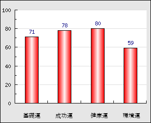 環境運 家庭や職場等での援助運・環境運を司ります。これが良いと配偶者や子供・職場の同僚などから助力が得られやすく、悪いと波乱・不和・孤独などがあります。 59点