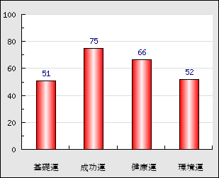 成功運 目的に対する成功運の強さをあらわします。この点数が高いほど自分の思い通りに成功し、逆に悪いと逆境・批判・障害などに苦心します。 75点