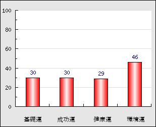 成功運 目的に対する成功運の強さをあらわします。この点数が高いほど自分の思い通りに成功し、逆に悪いと逆境・批判・障害などに苦心します。 30点