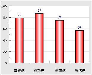 成功運 目的に対する成功運の強さをあらわします。この点数が高いほど自分の思い通りに成功し、逆に悪いと逆境・批判・障害などに苦心します。 87点