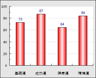 環境運 家庭や職場等での援助運・環境運を司ります。これが良いと配偶者や子供・職場の同僚などから助力が得られやすく、悪いと波乱・不和・孤独などがあります。 84点