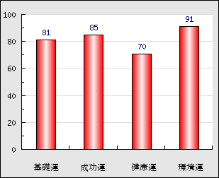 成功運 目的に対する成功運の強さをあらわします。この点数が高いほど自分の思い通りに成功し、逆に悪いと逆境・批判・障害などに苦心します。 85点