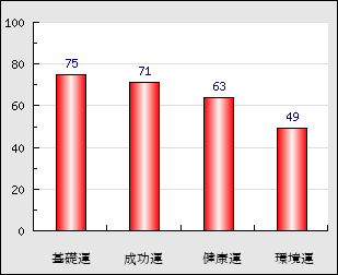 環境運 家庭や職場等での援助運・環境運を司ります。これが良いと配偶者や子供・職場の同僚などから助力が得られやすく、悪いと波乱・不和・孤独などがあります。 49点