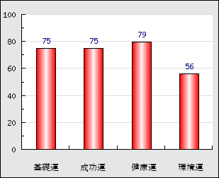 環境運 家庭や職場等での援助運・環境運を司ります。これが良いと配偶者や子供・職場の同僚などから助力が得られやすく、悪いと波乱・不和・孤独などがあります。 56点