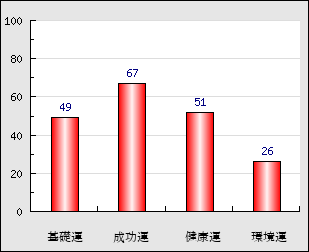 成功運 目的に対する成功運の強さをあらわします。この点数が高いほど自分の思い通りに成功し、逆に悪いと逆境・批判・障害などに苦心します。 67点