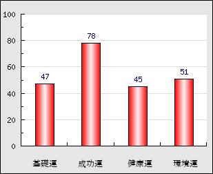 成功運 目的に対する成功運の強さをあらわします。この点数が高いほど自分の思い通りに成功し、逆に悪いと逆境・批判・障害などに苦心します。 78点
