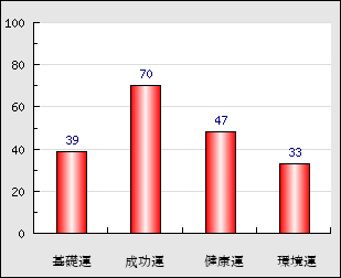 成功運 目的に対する成功運の強さをあらわします。この点数が高いほど自分の思い通りに成功し、逆に悪いと逆境・批判・障害などに苦心します。 70点