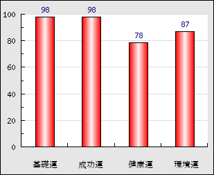 成功運 目的に対する成功運の強さをあらわします。この点数が高いほど自分の思い通りに成功し、逆に悪いと逆境・批判・障害などに苦心します。 98点
